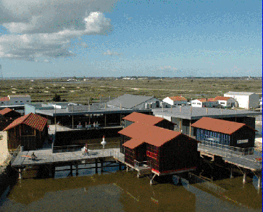 The centre has been created from the shell of an oyster processing factory, with new buildings extending it around and over a tidal lagoon. New display pavilions have been constructed in the form of the local “cabanes”, boat-sheds used by the local oyster-farmers, connected around the lagoon by a board-walk.